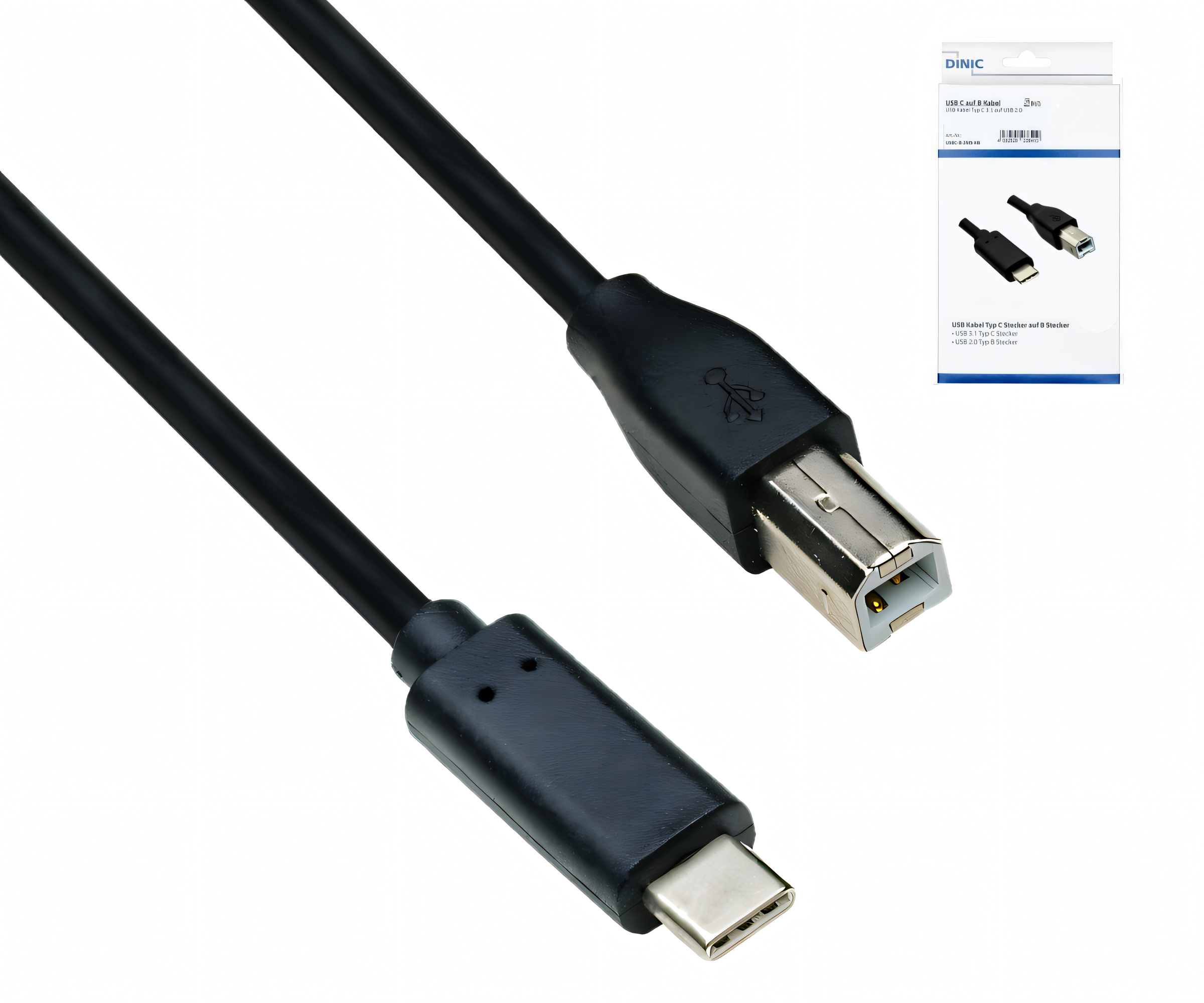 1× USB kabel USB-C (zástrčka) na USB 2.0 typ B (zástrčka), 2,00 m, černý; baleno v krabici DINIC (kartonová krabice) s otvorem Euro