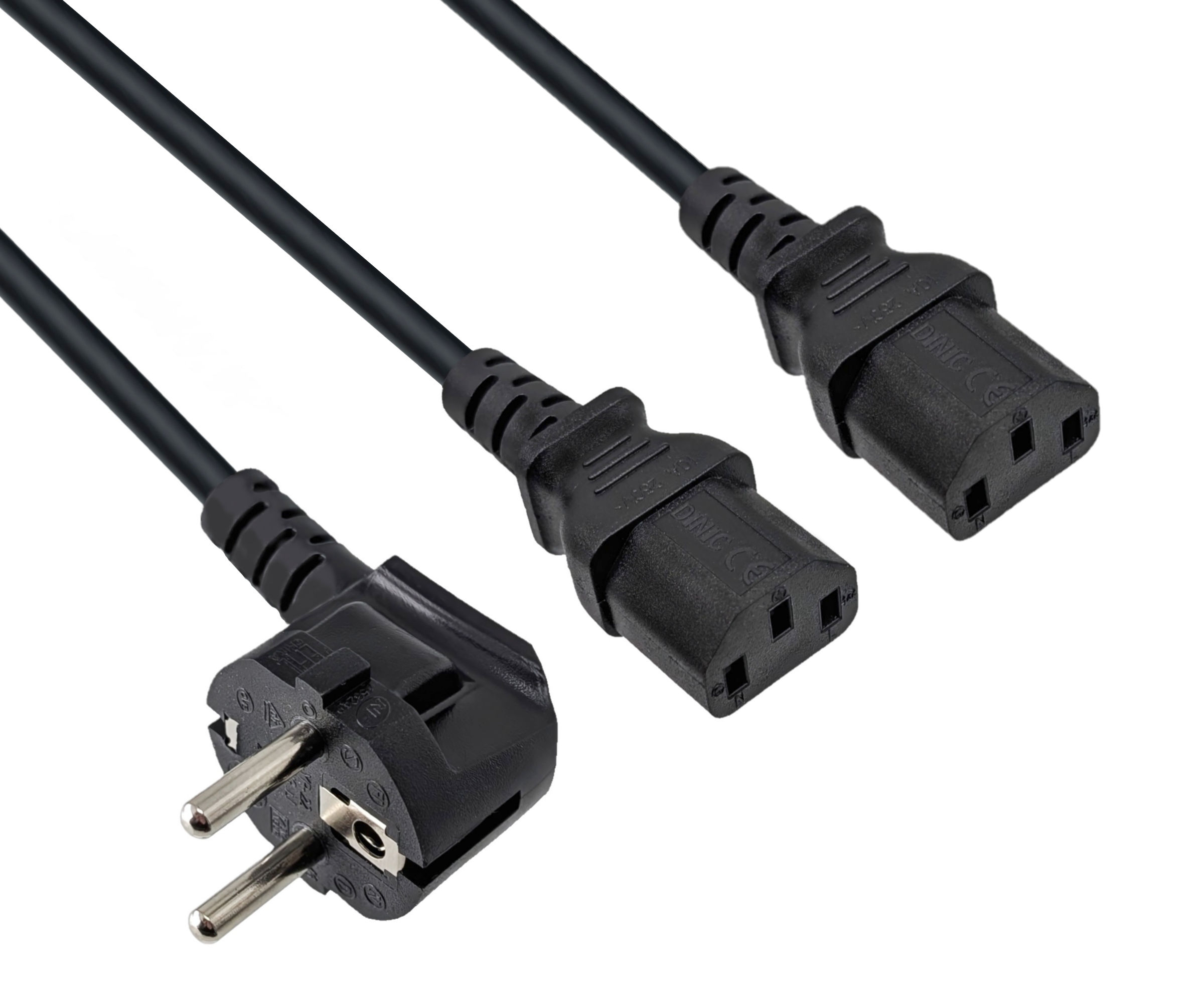 SEO: Y elektrotīkla kabelis 7/7 E/F 90° tipa ar 2 × IEC 60320 C13, 2,00 m, 3 × 1,0 mm², H05VV-F, DINIC, melns.